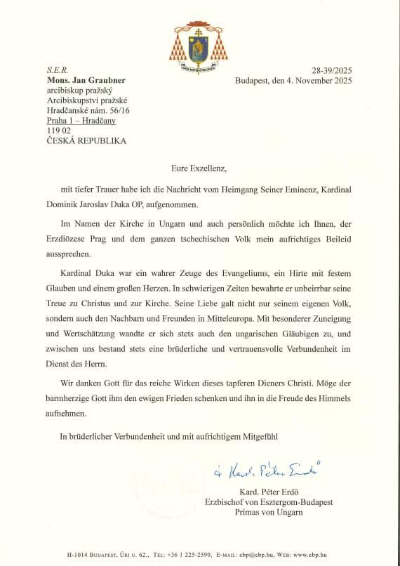 S hlubokým zármutkem jsem přijal zprávu o odchodu Jeho Eminence, kardinála Dominika Jaroslava Duky OP. Jménem církve v Maďarsku a rovněž sám osobně, vyjadřuji arcidiecézi pražské i celému českému národu, upřímnou soustrast.