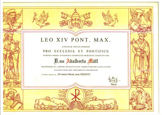 Mgr. Vojtěch Mátl přebral ve čtvrtek 23. dubna 2026 při slavnosti sv. Vojtěcha z rukou emeritního pražského arcibiskupa Mons. Jana Graubnera papežské vyznamenání Pro Ecclesia et Pontifice.
