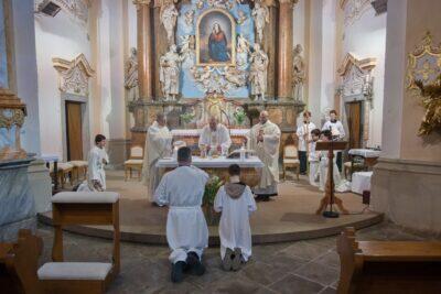 Jiskrné odpoledne se slunečními paprsky i pronikavým větrem zastihlo poutníky u jednotlivých zastavení křížové cesty kolem kostela. Následovala modlitba růžence a samotná poutní mše svatá, kterou sloužil Mons. Pavel Posád, pomocný biskup českobudějovický. Koncelebrovali P. Stanislav Brožka, duchovní správce farnosti Dobrá Voda a P. Zdeněk Mareš, děkan katedrální kapituly.