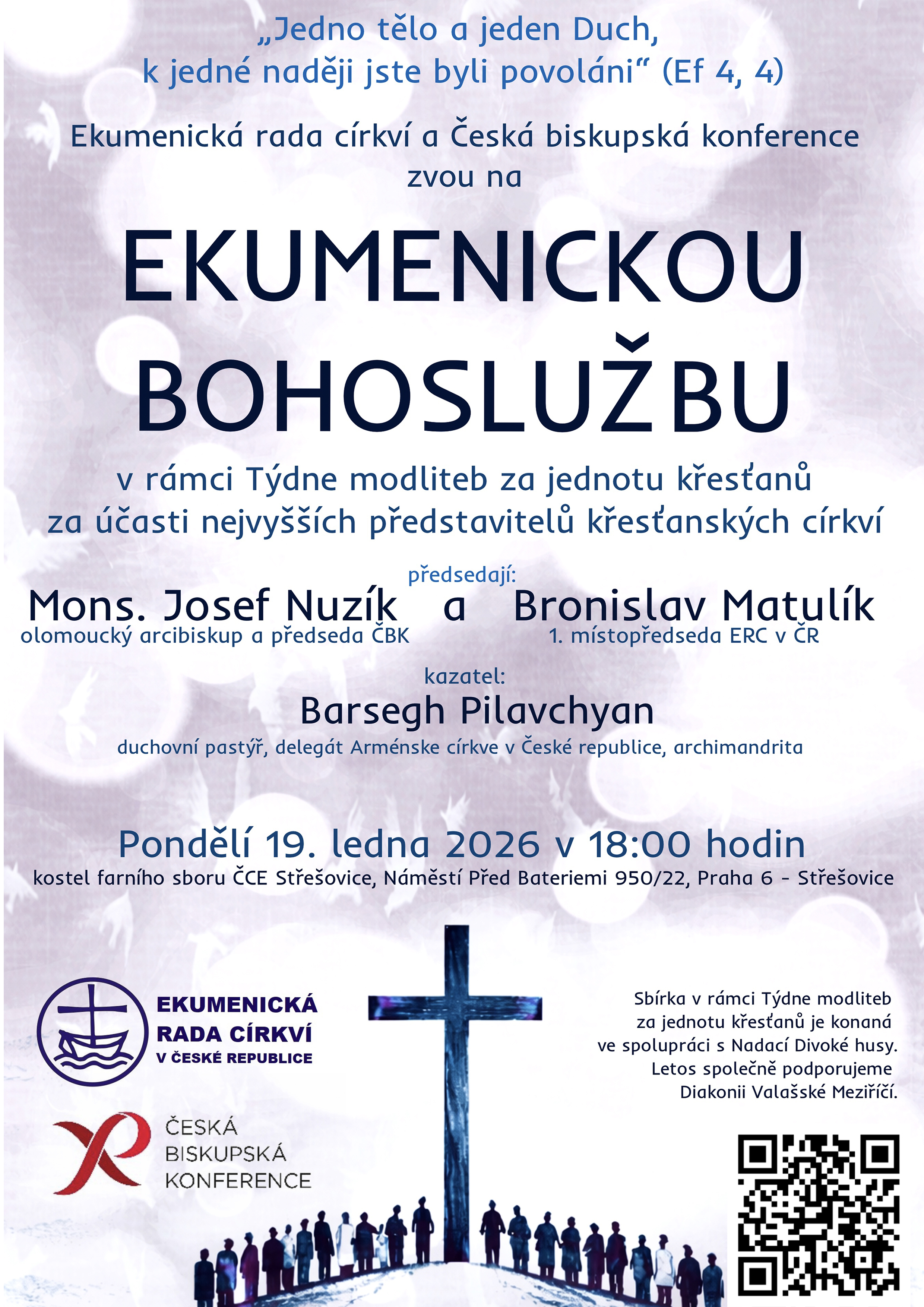 Ekumenická rada církví a Česká biskupská konference zvou na ekumenickou bohoslužbu v pondělí 19. ledna. Toto modlitební setkání se koná v rámci Týdne modliteb za jednotu křesťanů. Bohoslužby se účastní nejvyšší představitelé křesťanských církví v ČR.