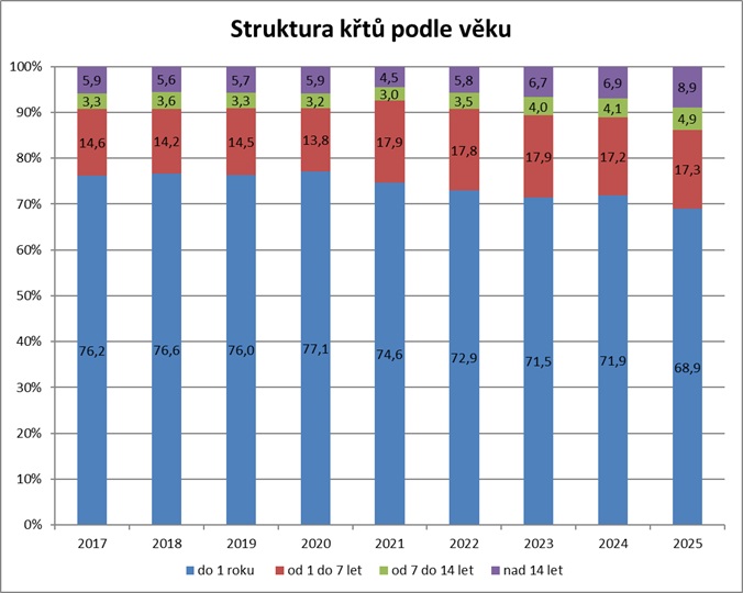 Podíl pokřtěných dětí do jednoho roku věku na počtu narozených zůstal v roce 2025 stejný jako v předchozím roce (12,1 %). Trend odkládání křtu do vyššího věku, který se výrazněji projevil během pandemie covidu, přetrvává i nadále – více než šestinu všech křtů tak tvoří děti ve věku 1–7 let.